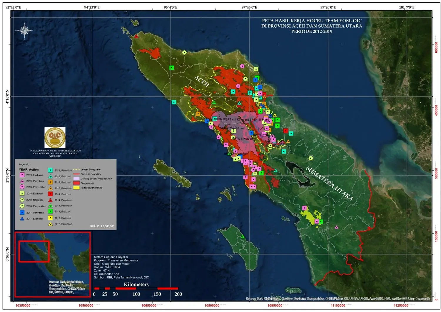 The Human-Orangutan Conflict Response Unit (HOCRU) was created in 2010 with UNESCO funding. As a project, HOCRU was created to address Human- Orangutan conflict in agricultural landscape in Northern Sumatra (Aceh and North Sumatra provinces). As a team unit, HOCRU is a direct response to the threats and their consequences to orangutans such as tackling the poaching, conflicts and illegal trade causes while at the same time limiting the consequences of habitat loss endangering orangutan’s populations. The project is in line with the Orangutan conservation action plan 2018-2027, recently agreed by the Indonesian government after consultation of relevant stakeholders. From 2010 to 2012, HOCRU focused on surveying, awereness of authorities and local communities, and coordinating with other NGOs which are working for the same cause. From 2012 onward, HOCRU moved to awareness, translocations, confiscations, evacuations and coordination with local authorities.